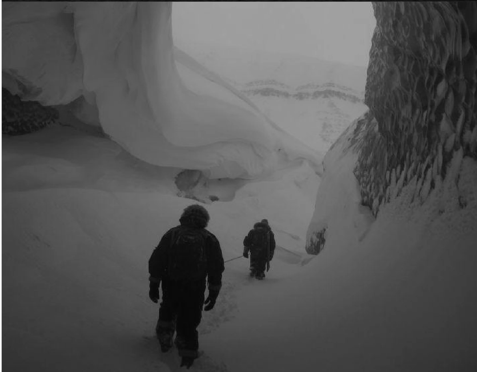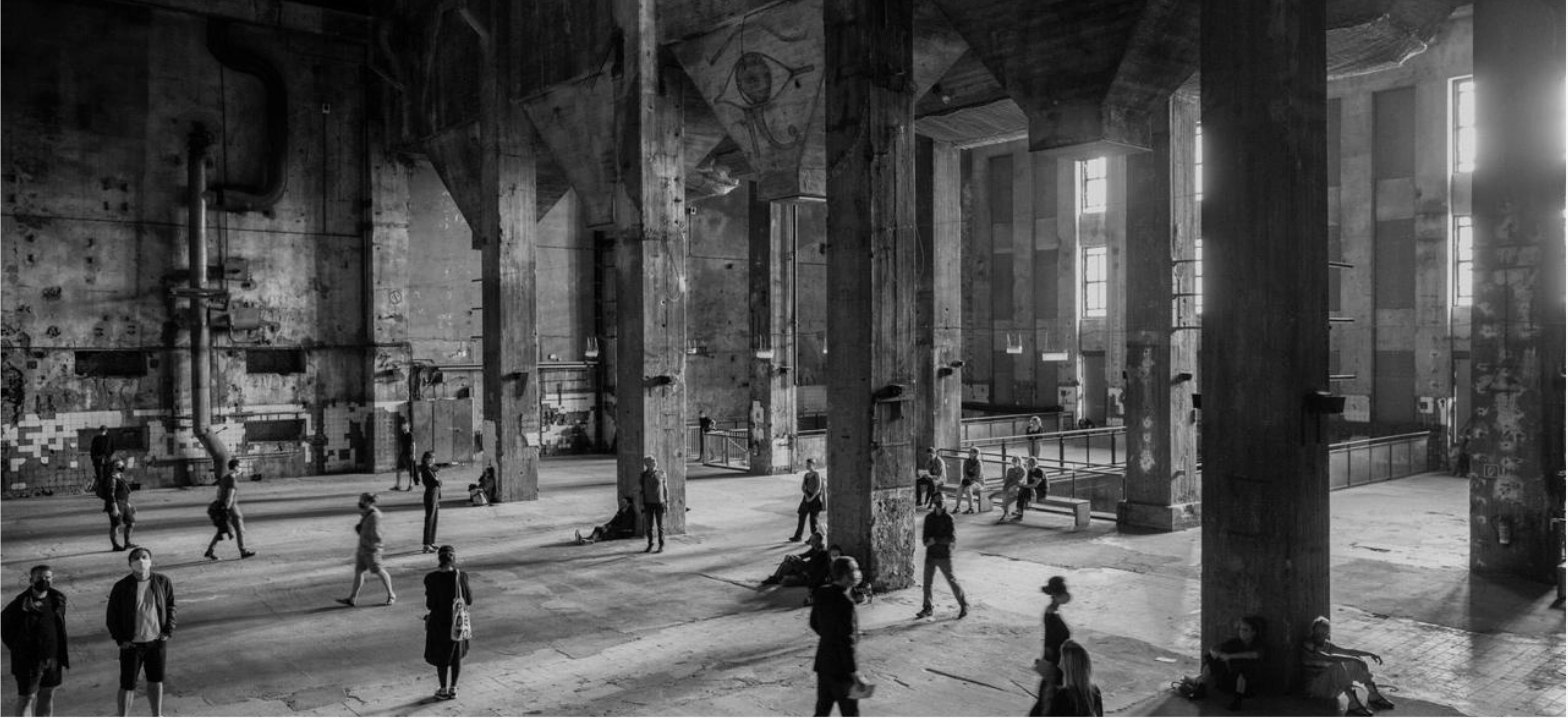 A brutalist structure split into two opposing masses of concrete, rising from the ground